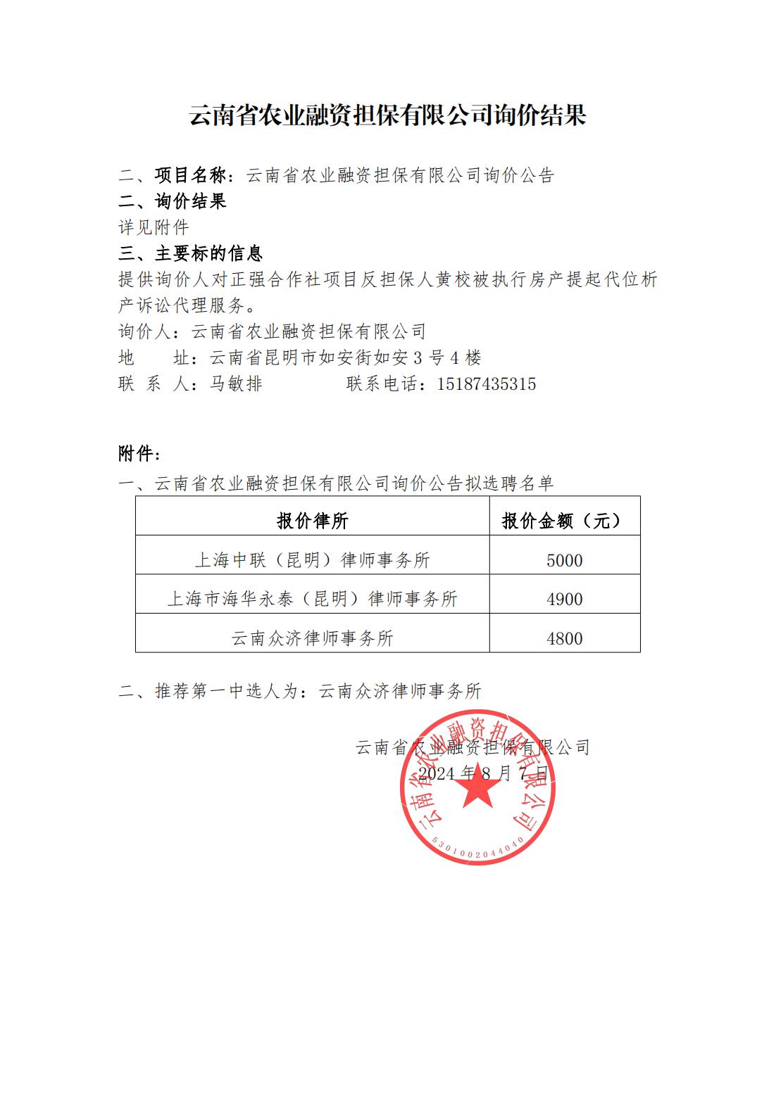 云南省農(nóng)業(yè)融資擔(dān)保有限公司詢價結(jié)果
