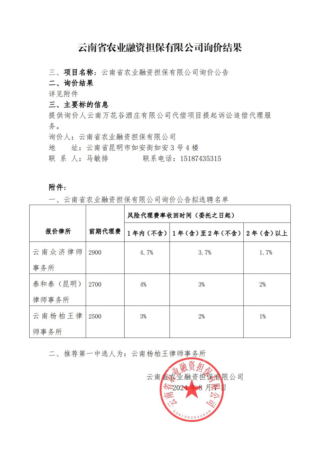 云南省農(nóng)業(yè)融資擔(dān)保有限公司詢價(jià)結(jié)果