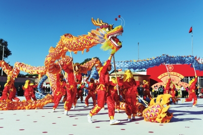 9月23日,秋高氣爽,艷陽高照,首屆中國農(nóng)民豐收節(jié)隆重舉行,主會場設(shè)在北京農(nóng)業(yè)展覽館。圖為來自北京市平谷區(qū)的農(nóng)民舞龍隊在盡情表演,以表達五谷豐登喜慶豐收的喜悅心情。