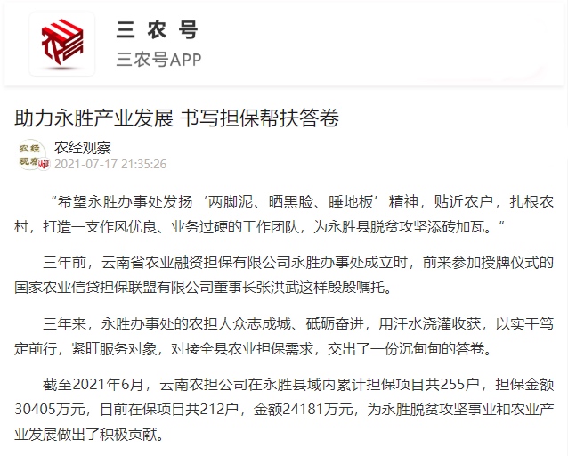 云南農(nóng)擔(dān)永勝辦事處自2019年8月22日成立,充分彰顯了云南農(nóng)擔(dān)服務(wù)網(wǎng)絡(luò)擴(kuò)面下沉的深度和力度,也體現(xiàn)了國家農(nóng)擔(dān)對云南省鄉(xiāng)村振興戰(zhàn)略實(shí)施的大力支持。2021年7月17日,《農(nóng)民日報(bào)》三農(nóng)號以“助力永勝產(chǎn)業(yè)發(fā)展 書寫擔(dān)保幫扶答卷”為題對云南農(nóng)擔(dān)永勝辦事處進(jìn)行了專題報(bào)道。以下是詳細(xì)內(nèi)容: