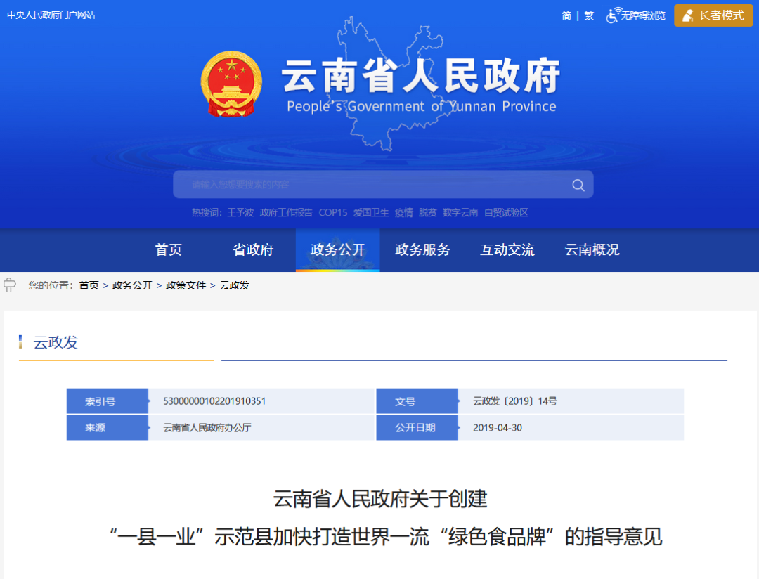 2019年云南省人民政府出臺(tái)了《云南省人民政府關(guān)于創(chuàng)建“一縣一業(yè)”示范縣 加快打造世界一流“綠色食品牌”的指導(dǎo)意見(jiàn)》(以下簡(jiǎn)稱《指導(dǎo)意見(jiàn)》)