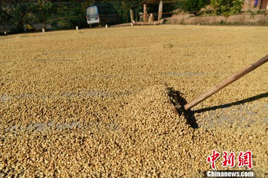 圖為普洱咖農在太陽下曬咖啡。任東攝