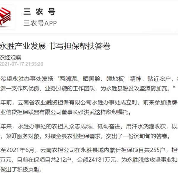 2021年7月17日,《農(nóng)民日報》三農(nóng)號以“助力永勝產(chǎn)業(yè)發(fā)展 書寫擔保幫扶答卷”為題對云南農(nóng)擔永勝辦事處進行了專題報道。