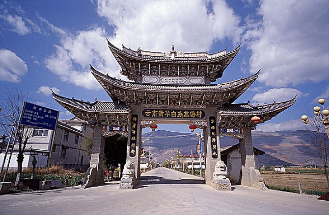 新華村位于大理州鶴慶縣西北部鳳凰山腳下,一個(gè)集田園風(fēng)光、民居、民俗和民族手工藝品生產(chǎn)加工為一體的白族村寨,符合農(nóng)業(yè)觀光定義分類中的觀光副業(yè)(與農(nóng)業(yè)相關(guān)的具有地方特色的工藝品及其加工制作過程)。新華村依山旁水,是依原生態(tài)自然村落建成的文化旅游區(qū),轄區(qū)有1166戶,海拔在2000―2300米之間,位于鶴慶縣城西北部,距麗江39公里,白族占總?cè)?8.5%,是一個(gè)典型的白族寨子。2001年,新華村因其悠久的手工藝文化、獨(dú)特的民風(fēng)民俗及優(yōu)美的田園風(fēng)光被國家文化部、中國村社發(fā)展促進(jìn)會(huì)分別命名為"中國民間藝術(shù)之鄉(xiāng)"和"中國民俗文化村",2006年,新華村又榮獲"云南十大名鎮(zhèn)"的稱號(hào)。新華村的"小爐匠"自唐代南詔國時(shí)期就開始加工金銀銅等金屬手工藝品,至今已有一千多年的歷史。新華村兼有優(yōu)美的自然景觀,周圍山水交相輝映,地下水儲(chǔ)量豐富,行政區(qū)境內(nèi)的萬畝草海濕地和清澈甘醇的農(nóng)家泉眼。獨(dú)具地方民族特色的建筑風(fēng)格,豐富清澈的水域,既不乏江南水鄉(xiāng)的柔美,更具有高原獨(dú)特的水鄉(xiāng)情結(jié)。2009年12月28日,國家旅游局正式批準(zhǔn)"銀都水鄉(xiāng)"新華村為國家4A級(jí)旅游行政區(qū)。