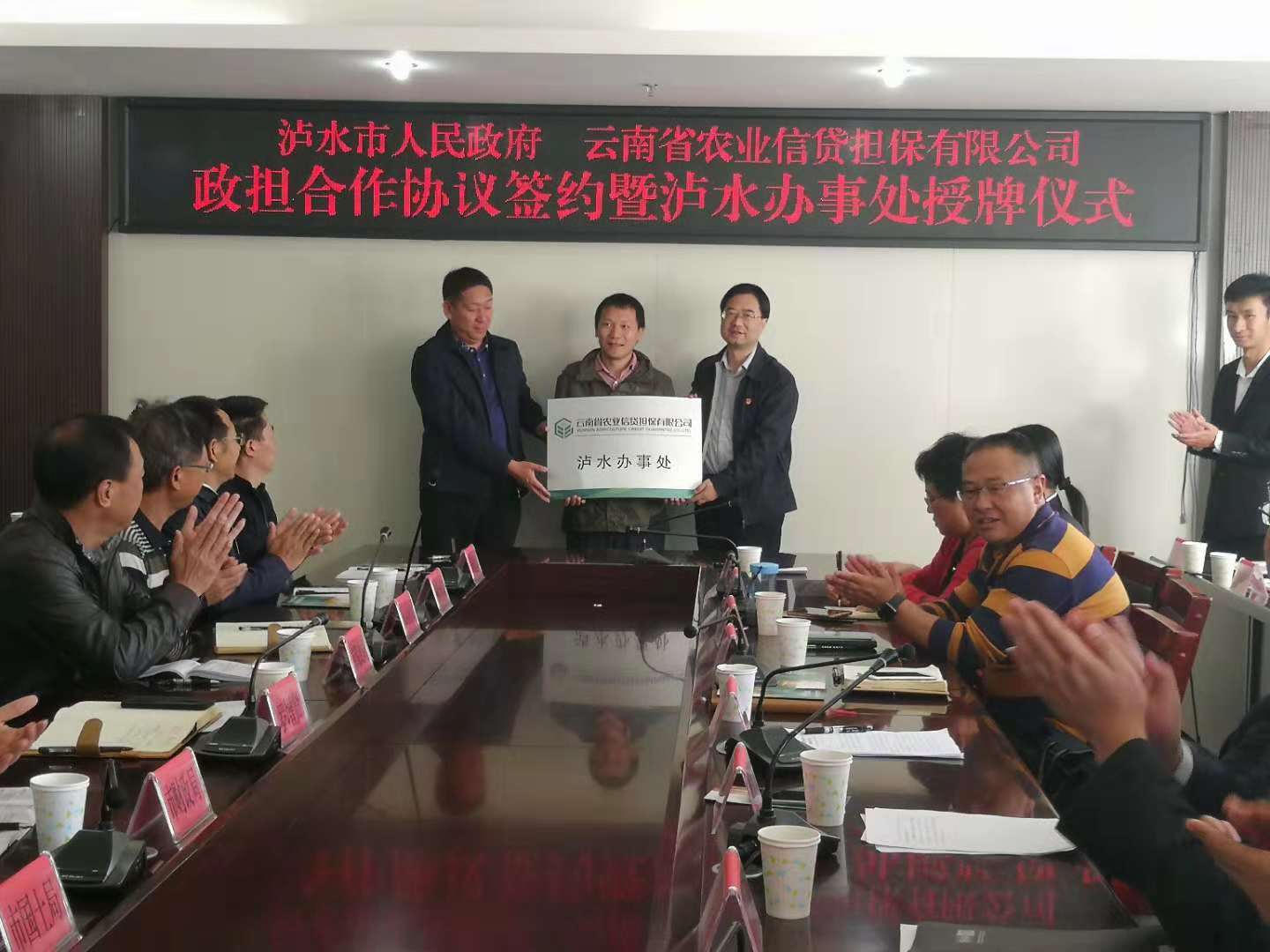 10月24日上午,云南省農(nóng)業(yè)信貸擔(dān)保有限公司瀘水辦事處授牌儀式在瀘水市人民政府正式舉行,瀘水市市委常委、常務(wù)副市長(zhǎng)羅增賢同志、公司董事長(zhǎng)郭影、副總經(jīng)理廖寅皓出席儀式。