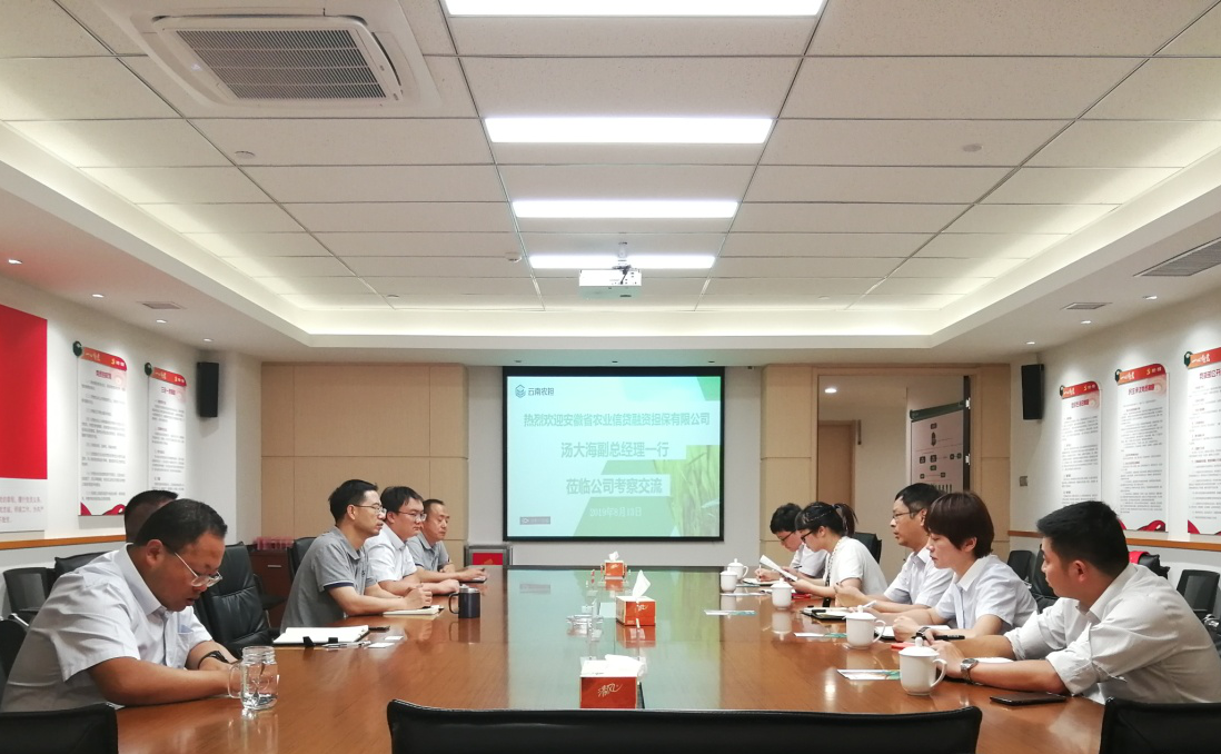 7月23日-7月25日,安徽省農(nóng)業(yè)信貸融資擔保有限公司(以下簡稱安徽農(nóng)擔)副總經(jīng)理湯大海率隊赴云南省農(nóng)擔公司調(diào)研交流。公司董事長郭影、副總經(jīng)理廖寅皓率風控部、戰(zhàn)略部與安徽農(nóng)擔公司進行了座談交流。