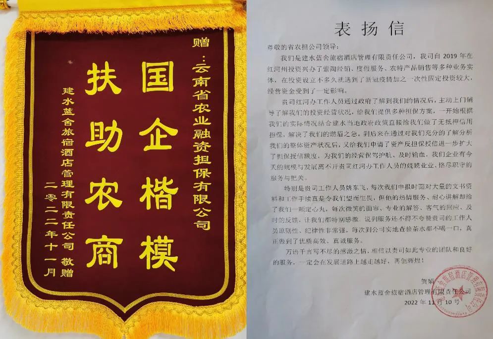 11月16日,云南省農(nóng)業(yè)融資擔(dān)保有限公司收到擔(dān)??蛻艚ㄋ{(lán)舍旅宿酒店管理有限責(zé)任公司送來的一封表揚(yáng)信和一面印有“國企楷模 扶助農(nóng)商”的錦旗,表達(dá)對云南農(nóng)擔(dān)公司助企紓困的感激之情。
